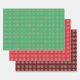 Christmas wrapping paper in green, red, and burgundy background with elegant golden snow flakes designs.