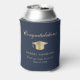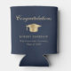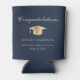 Toast the graduate at their graduation party with this elegant blue can cooler featuring a gold grad cap, "Congratulations" in a classic script and the graduate's name, school and class year in simple modern typography.