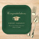 Elegant green graduation party paper plates featuring a gold grad cap, "Congratulations" in a classic script and the graduate's name, school and class year in modern typography.