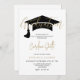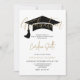 Elegant Graduation Party Invitation. featuring falling black mortarboard caps, and a modern text template that is easy to personalize.
