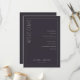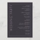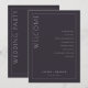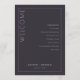 This elegant wedding program features a minimalist design with a dark gray background and clean, modern typography. The layout is vertically oriented, divided by a thin white line, creating two sections: one for the welcoming "WELCOME" in large serif font and another listing ceremony events in a centered sans-serif style. Customizable placeholders allow for personalization with names and dates, making it perfect for formal celebrations. The overall mood is sophisticated and anticipatory, ideal for a memorable event.