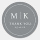 This elegant wedding sticker features a minimalist circular design with a solid gray background. The layout includes prominent initials "M" and "K," separated by a vertical line, followed by the phrase "THANK YOU" in a refined serif font. Below, a date is displayed in a clean sans-serif typeface, adding a modern touch to the classic style. The overall aesthetic conveys sophistication and gratitude, making it perfect for expressing appreciation at your special event.