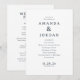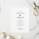 This wedding program features a minimalist and elegant design with a vertical layout, centered alignment, and ample negative space. The monochromatic color palette, dominated by shades of gray on a white background, creates a clean and sophisticated look. Typography is the primary visual element, with bold serif fonts highlighting key details like the couple's names and ceremony schedule, while sans-serif fonts provide a modern touch for the date and location. The overall mood is one of simplicity and formality, making it perfect for couples seeking a chic and understated aesthetic for their special day.