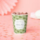 A charming, custom detail for any celebration, these personalized paper cups have three lines of text and a background pattern of pale sage green and white hydrangea flowers to dress up the beverage table of any bridal or baby shower.