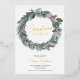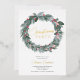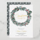 Elegant green blue red floral Christmas wreath party invitation with watercolor leaves, mistletoes, berries in red and pink and green and blue pine branches illustration.