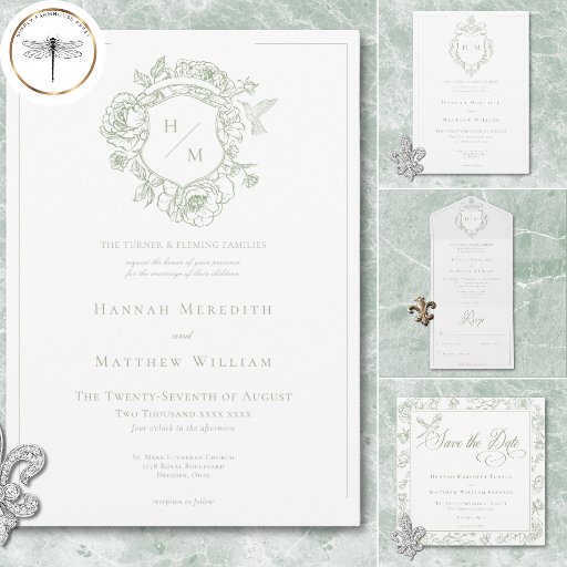 Elegant Green Chinoiserie Bird & Crest Wedding Save The Date