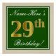 This simple and elegant birthday party poster design features a personalized message like "Name-Here’s 29th Birthday!" (with the "29th" having a faux/imitation gold-like colouring look) within a green-coloured square area featuring a simple border outline. The name is in an elegant white-coloured script-like text, and can be personalized. A personalised birthday party poster like this could perhaps be used as a decoration at a party being held for somebody who is celebrating their twenty ninth birthday. [~Z0000235]