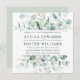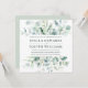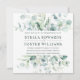 This square engagement party invitation features painted watercolor eucalyptus, botanical green, and light blue leaves with modern calligraphy.