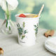 This customizable paper cup features a lovely watercolor design of elegant green foliage. A delicate stem with multiple branches and soft, green leaves is repeated three times around the cup. The leaves are rendered in a watercolor style with subtle variations in colour, from a light, airy green to a deeper, more saturated shade, creating a natural and artistic look. The background is a soft, neutral grey, which allows the green leaves to stand out beautifully.