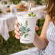 Below each leaf cluster, there is a space for customizable text, shown here in a flowing script font. This makes the cup perfect for any event, from a wedding celebration with "Vanessa & Michael Est. 2025" to a baby shower with "It's a Boy! Mason's Baby Shower." You could also use it for "Isabella's Bridal Shower 2025," "Happy Birthday, Sarah!," or even a "Miller Family Reunion."