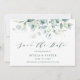 This wedding save the date flat card features painted watercolor eucalyptus, botanical green, and light blue leaves with modern calligraphy.