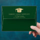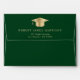 Elegant green graduation return address envelope with a gold grad cap and the graduate's name and address in light gold modern serif typography on the back flap.