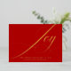 Share the spirit of the season with this elegant Joy Christmas card featuring a gold foil script design on a vibrant red background. The flowing typography and minimalist layout bring timeless sophistication to your holiday greetings.