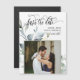 This save the date magnetic card features elegant watercolor greenery foliage leaves arrangements and beautiful calligraphy and simple serif typography font with a square photo frame on a white background for a clean minimalist and modern look, which is a beautiful way to inform about your upcoming wedding or elopement. Just personalize the text and add a personal touch with a beautiful photo of the couple.