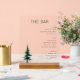 This acrylic sign features a minimalist and elegant design, perfect for any bar or home setting. The layout is clean and balanced, with "THE BAR" prominently displayed at the top in bold serif font, followed by neatly organized sections for beer, wine, and spirits in simple sans-serif type. A realistic illustration of a green coniferous tree adds a touch of nature to the otherwise text-focused design, creating a sophisticated yet inviting atmosphere. The color palette is primarily black and white, with subtle green accents from the tree, enhancing the modern and uncluttered aesthetic. Ideal for displaying your drink options, this sign combines functionality with stylish decor.