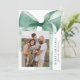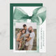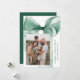 Celebrate the season in style with this elegant Christmas card featuring a stunning green watercolor bow against a white background. Personalize the design by adding your vertical family photo in a unique offset layout. Your holiday greeting is displayed in classic green serif lettering, accompanied by your family name in an elegant handwritten script. With space for two additional photos on the back, this card allows you to share even more cherished memories. Perfect for spreading festive joy while showcasing your personal touch.