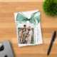 Celebrate the season in style with this elegant acrylic Christmas card featuring a stunning green watercolor bow against a transparent acrylic background. Personalize the design by adding your vertical family photo in a unique offset layout. Your holiday greeting is displayed in classic green serif lettering, accompanied by your family name in an elegant handwritten script. Perfect for spreading festive joy while showcasing your personal touch.