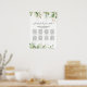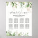 Elegant greenery wedding table plan featuring a stylish white background, botanical watercolor green foliage, gold glitter accents, and a modern wedding seating chart template of 8 tables.