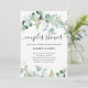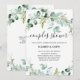 This trendy couples wedding shower invitation features elegant watercolor eucalyptus greenery, with plenty of foliage, green leaves, and branches. They decorate a simple white background with modern script typography. The back of the card has a spot for a scannable QR code so guests can easily rsvp. The perfect way to invite friends and family to celebrate!