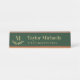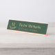 Elegant dark green nameplate with your initial above a curved greenery twig against a dark green background under your name and title in tan.