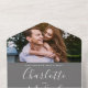 All in one wedding invitation featuring your special photo and elegant grey signature script name and monogram initials on a grey background. The invitation includes a perforated RSVP card that’s can be individually addressed or left blank for you to handwrite your guest's address details. Designed by Thisisnotme©