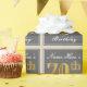 This simple and elegant wrapping paper design features a personalized message like "Name-Here’s 70th Birthday" (with the "70th" having a faux/imitation gold-like colouring look) within a grey-coloured square area featuring a simple border outline. The name is in an elegant white-coloured script-like text, and can be customized. Wrapping paper like this could perhaps be used when wrapping birthday gifts for somebody who is celebrating their seventieth birthday. [~Z0000222]