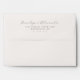This wedding envelope features a minimalist design with centred text on a clean white background, creating an elegant and balanced look. The colour palette includes soft grey hues that provide a subtle contrast against the backdrop, enhancing readability without overwhelming the eye. The typography combines a flowing cursive script for names with crisp sans-serif fonts for addresses, ensuring both style and clarity. Perfect for couples seeking a modern yet sophisticated touch, this design conveys a sense of calm professionalism ideal for formal occasions.