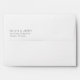 This wedding envelope features a minimalist design with clean lines and ample negative space, creating an elegant and modern aesthetic. The colour palette consists of a single dark grey hue on a white background, emphasizing simplicity and sophistication. The typography is bold and slightly condensed in a serif font for the names, while the address uses a lighter weight of the same font, ensuring clarity and legibility. The overall mood is formal and refined, making it perfect for official wedding communications or announcements.