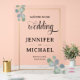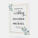 This elegant acrylic wedding welcome sign showcases beautiful hand-painted eucalyptus leaves surrounded by a gold frame. It features exquisite calligraphy paired with a classy serif font. For more advanced customization options, please select the "Click to customize further" option under the "Personalize this template" section. Matching items are also available.