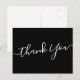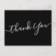 Elegant black thank you postcard featuring the text "thank you" across the card in a white handwritten script font