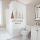Elegant festive bathroom shower curtain design features a classy display of snowy Christmas trees in red, gold & pink on a snowy neutral cream lightly striped beige background. The bottom section is covered in white snow with "Happy Holidays" in elegant classic typography. Add a custom name or line of custom text in matching red script with the simple-to-use template.