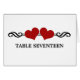 Sweet and whimsical Elegant Hearts Wedding Table Number Card featuring a fancy swirl border adorned with a pair of dark red hearts. This modern table card is the perfect choice for a chic and elegant wedding. Easy to customize, simply add the appropriate table number(s) in the text field provided. Click "Customize It" to find additional personalization options.