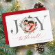 This elegant Christmas card features the word "Joy" with your photo as the "o". It's in silver and red with room on the back for your holiday / Christmas greeting.