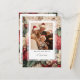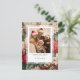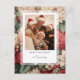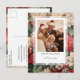Elegant watercolor style floral pattern featuring assorted Christmas botanicals in white, burgandy red and green, with opaque bordered photo template. Back features editable text fields.