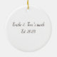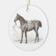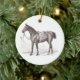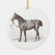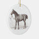 Stylish horse ornament personalized with the names and date of establishment of your favourite horse loving couple. The front is illustrated with an elegant engraving of a saddled horse, the back printed with the fully editable text " name1 & name2's ranch, Est. YEAR". Perfect as a housewarming present for your rider friends.
