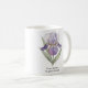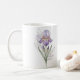 This elegant ceramic mug features a minimalistic watercolor illustration of a beautiful iris flower in soft purple, violet, and pink tones, accented with delicate line art. It embodies peaceful charm and includes a poetic quote, making it perfect for refined sips and a serene atmosphere.