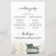 These wedding programs are elegant and tasteful, while still being budget friendly. The design features a single long-stemmed ivory, white, or cream coloured rose lying on its side, reflecting in a pool of water with waves and ripples. The typography features lacy black script calligraphy, and there is room for details on the ceremony, the bridal party, and a short thank you.