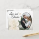 This beautiful postcard is a simple yet thoughtful way to thank your wedding guests. It features a lovely design with your wedding photo in an oval shaped frame, and a single long stemmed ivory or white rose reflecting in a pool of water. The caption reads "Love and Thanks" and there is space for your custom note on the back as well as your signature.