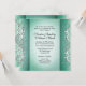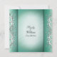 This gorgeous invitation has two columns on either side creating a border with white frill accents. It is a shade of what I can best describe as jade green . Text on both sides. Names and date can be added to the first side.