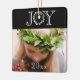 Festive "Joy" typography with faux eucalyptus wreath for the letter "O". Add your personal photo to complete this pretty tree ornament. Elegant black background. Pattern on front is carried over to the back of this card. Add year to further customize.