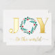 Beautiful Joy to the World real gold foil card with a lovely holly and berries botanical wreath. Bible verse Ask and you will receive, so that your joy may be made full. John 16:24. Room for holiday message, names and date on the back.