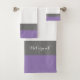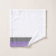 Élégant Lavande Purple Stripes Script Monogram Bath Towel Set est un design moderne avec des bandes horizontales dans les couleurs de violet clair, blanc et gris sur le devant inférieur et est personnalisée avec le nom de famille dans élégant écriture de script blanc. L'aménagement est soigné et rafraîchi par rapport à la décoration de la salle de bains.