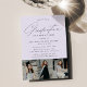 Invite guests to celebrate the grad with our elegant photo graduation party invites! The design features a modern calligraphy script with your graduation party details displayed in black lettering against a light purple background. The unique graduation party invites feature three photos in a row at the bottom of the design. The multi-photo graduation invite reverses to display a simple lavender and white diagonal stripe pattern.