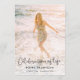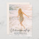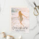 A modern, minimalist full photo order of service funeral program to celebrate the life of your loved one in a minimalist clean simple design style featuring a elegant handwritten script font and a soft pastel peach background. The design template can easily be personalized with your own photo and text to create a special tribute for your loved one's funeral, memorial or celebration of life. The image shown is for illustration purposes only to be replaced with your own photo. The placeholder image shows a happy young woman with wavy long blonde hair wearing an elegant chic pastel floral summer dress standing in the sea at sunset on a sandy beach in the shallow breaking waves. #funeral #orderofservice