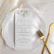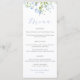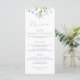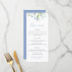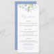 Elegant wedding menus with a top border of light blue watercolor flowers and greenery and the heading "menu" in light blue modern calligraphy font, Edit with your names, wedding date and menu. Click "customize further" to adjust layout.