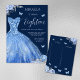 With its captivating light blue and silver glitter gown design and the option to change the dark blue background, this invitation exudes elegance and charm. The shades of blue colours creates a visually stunning contrast that is sure to leave a lasting impression on your guests.