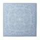 This decorative light blue and white ceramic tile features an elegant lace-imitation pattern with flourish flowers and butterflies.