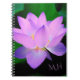 Stunning lilac lotus flower in full bloom against dark green foliage on personalized notebook.