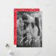 Elegant Valentine's day card featuring your vertical photo with "love" displayed in a white calligraphy script with an optional white gradient. Personalize the Valentine's day photo card with a custom greeting and your name. The photo Valentine's day card reverses to display a playful red and white heart pattern.