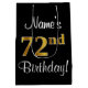 This luxurious, sophisticated, and stylish birthday-themed gift bag design features the ordinal number "72nd" having a large faux/imitation gold-like appearance, along with a birthday greeting message and a customizable recipient name in a script-style font. The background is coloured black. A giftbag like this might be used when wrapping gifts being given to somebody in celebration of their seventy second birthday. [~Z0000513]
